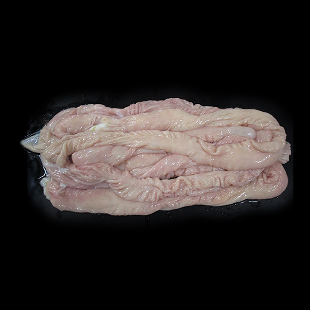 小腸よりもやや太く、ジューシーでコシのある歯ごたえが特徴です。一般的には、大腸を割いたもの(サキ)が流通しています。神奈川県厚木市周辺では、大腸を割かずに筒状のままで裏返しにしたもの(シロホルモン)を焼いて食べるのが好まれています。そのために処理した筒状の大腸をマルチョウと呼びます。